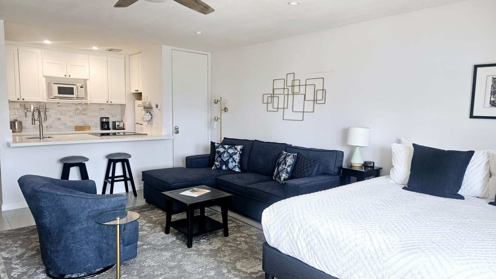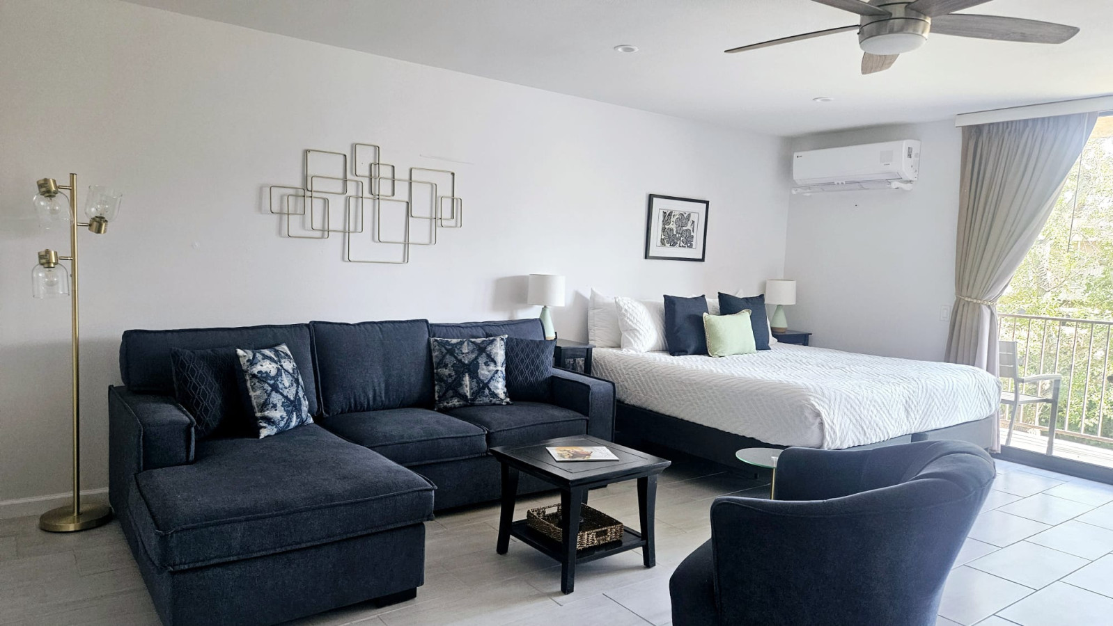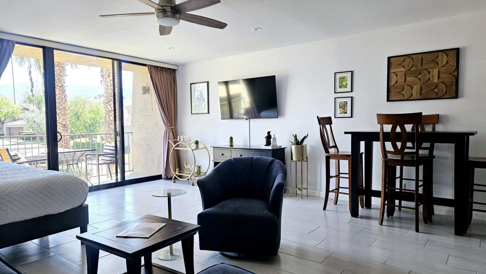 / nightSol & Sips Studio Escape to our charming studio suite at the iconic Shadow Mountain Resort in Palm Desert, where mid-century modern elegance meets desert comfort. This inviting space features a plush king-size bed, a pull-out sofa, stylish gold bar cart with a wine fridge. Just steps away, indulge in the vibrant shops and delicious dining of El Paseo. Unwind by the pool, or explore hiking, tennis, and golf options. Enjoy unforgettable memories in this beautiful desert oasis. Imagine escaping to your very own slice of paradise at the iconic Shadow Mountain Resort in Palm Desert, CA. Our delightful studio suite invites you to step into a world of mid-century modern vibe, where the spirit of the desert blends seamlessly with the art and cozy comfort. As you walk through the door, you’re greeted by a tasteful décor that sets the stage for relaxation. The plush king-size bed beckons you to sink into its softness after a day of exploring, and the convenient pull-out sofa offers extra space for friends or family to join the fun. Adorned with lively pieces like "Summer Cocktails with Shag," the studio captures the essence of carefree days spent under the sun, while a stunning mid-century gold bar cart invites impromptu happy hours right at home. Picture yourself shaking up cocktails and toasting to the warm desert evenings, with your favorite wine perfectly chilled in the wine fridge just a reach away. In the fully-equipped kitchen, you can whip up your favorite meals or savor a leisurely breakfast at the bar. Step out onto your quaint private balcony, where the gentle desert breeze whispers the promise of adventure. With every sip of your morning coffee, you can embrace the serenity of your surroundings and dream about the day ahead. Just a short stroll away, El Paseo awaits with its fabulous shopping and delectable dining options. Picture yourself wandering through boutique stores, discovering unique treasures, and savoring a meal at one of the many nearby restaurants, feeling the vibrant energy of the Palm Desert community. After a day of exploration, return to the resort to unwind by the glistening swimming pool or soak in the inviting hot tub—perfect for stargazing under the expansive desert sky. If the outdoors call to you, hiking trails, Joshua Tree National Park, the Indian Wells Tennis Gardens, and top-notch golf courses, are all within easy reach. You can even book tennis lessons right at the resort, ensuring your active lifestyle continues during your stay. If music is your scene, Coachella and Stagecoach Festivals are a must! Your Palm Springs adventure awaits! Whether you’re lounging by the pool, enjoying a sunset drink on your balcony, or indulging in the local scene, our charming studio suite at Shadow Mountain Resort is the perfect base for creating unforgettable memories. Book now and immerse yourself in the beauty and allure of this stunning desert oasis! As your hosts, we have extensive experience hosting and love to ensure our guests have a memorable stay. Whether it's providing recommendations for local attractions or assisting with any needs during your visit, we are dedicated to making your stay at "Sol & Sips" unforgettable. At Prestige Point Vacation Homes, our passion is creating the perfect space for families and friends to connect and bond. Whether it’s family getting together, golf buddies on a getaway, or a girls' retreat, we’re here to provide an unforgettable experience filled with warmth and joy. Can’t wait to welcome you! Weekly Discount 7 Days 10% Monthly Discount 25% STUDIO LAYOUT FULL KITCHEN refrigerator 4 burner electric cook top range with oven microwave dishwasher coffee maker toaster blender KITCHENWARE plates, bowls, glasses, mugs serving dishes cutlery pots & pans mixing bowls spices DINING dining table for 4 dining counter with 2 stools SLEEPING king size bed, optionally converts to 2 twin bed queen size pull out sofa bed STORAGE closet & shelving BATH shower/tub combo dual vanity with sinks separated by door to toilet LINENS bedding and bathroom linens supplied pool towels BALCONY bistro table & chairs LAUNDRY coin laundry available in the building RESORT RESTAURANTS Above The Eight Restaurant & Bar - Open Seasonally TENNIS & PICKLEBALL Tennis & Pickleball are available when participating in a paid lesson, live ball, clinics and paid pickleball lesson. Contact Shadow Mountain Pro Shop. GOLF Shadow Mountain Golf Course is adjacent to the resort. ACCESS & PARKING Our studio suite has one designated covered parking stall. It is the top floor of a two story building with one flight of stairs up to the door. There is no elevator. Enjoy access to 3 pools and 5 Hot Tubs just steps from your front door. LOCATION 30 minutes from Palm Springs Airport & downtown Palm Springs 5 minutes from El Paseo Drive with shopping & restaurants 40 minutes to Joshua Tree National Park 10 minutes to Indian Wells Tennis Gardens REQUIREMENTS minimum rental age is 25