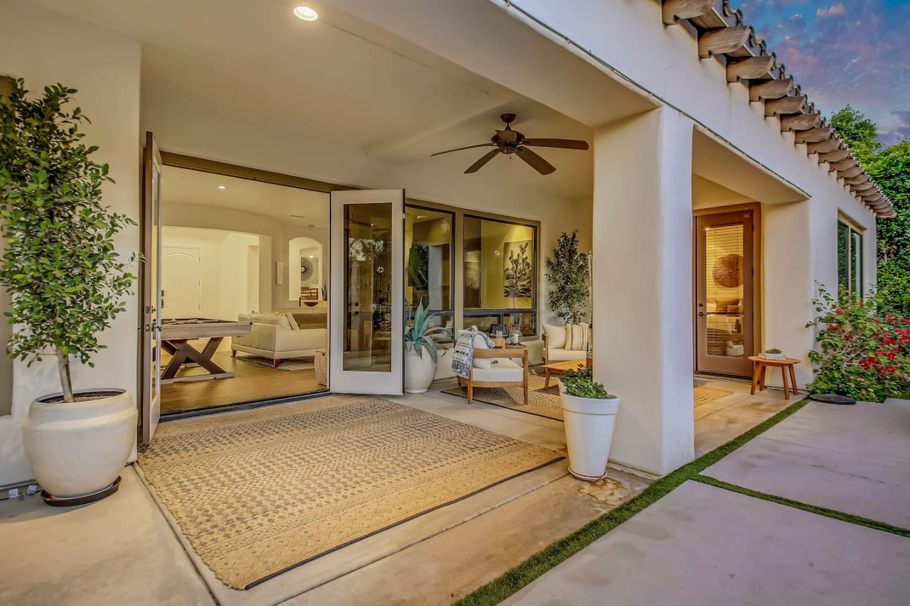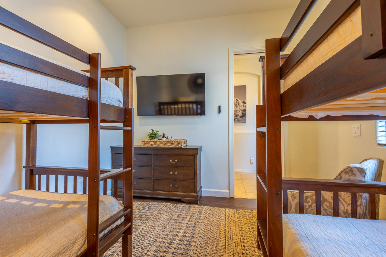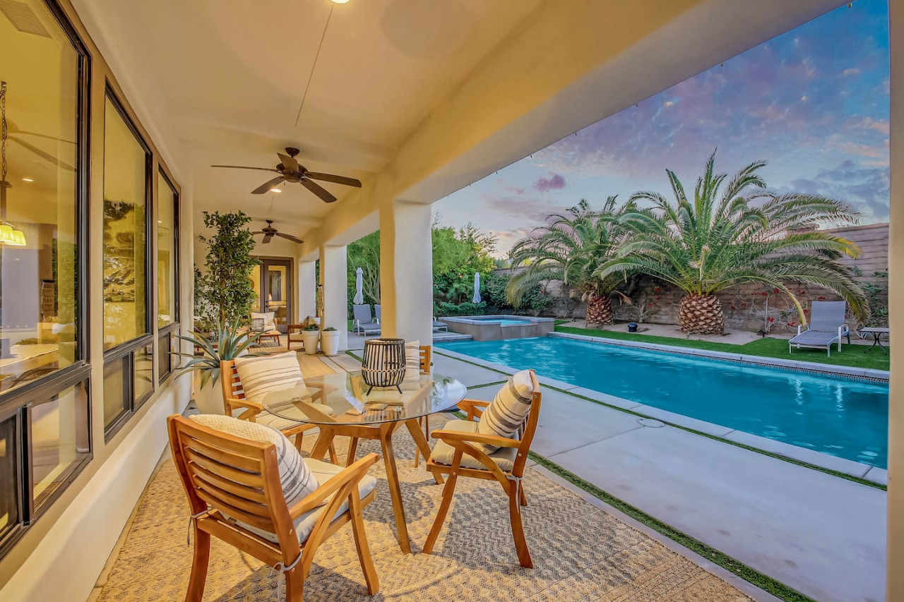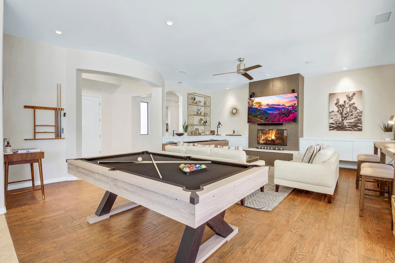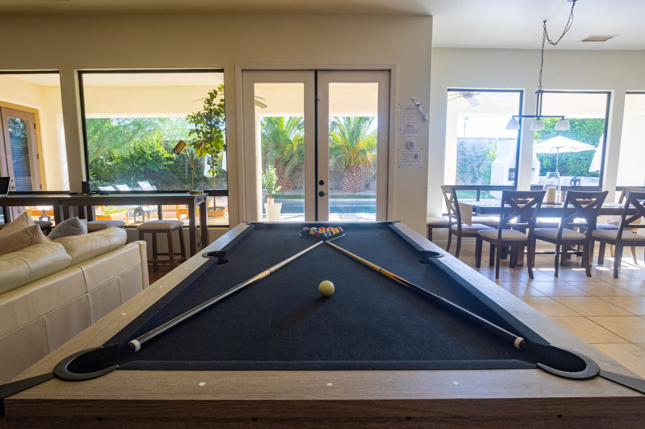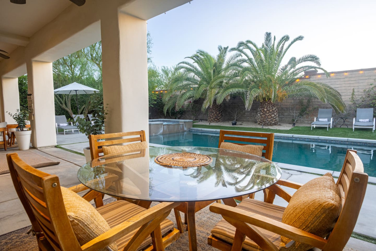 / nightWe are thrilled to announce that our stunning vacation property will be featured on the Emmy-Award winning show, "Staycation!" This is your chance to experience the luxurious charm and unique amenities that have captured the attention of the TV world. Escape to "Paraiso Del Sol," where paradise meets the sun. Enjoy desert-themed art, a spacious kitchen, and numerous amenities including a large pool, hot tub, outdoor kitchen with fireplace and firepit, putting green, and swaying palm trees. This gated Montage community home offers parking for 8 cars and is ideally located near Indian Wells Tennis Gardens, Polo Grounds, Coachella, and Stagecoach. Perfect for special celebrations, we offer exclusive Bachelorette and Birthday Decor Rentals with setup to make your gathering extra memorable. Choose from poolside patio decor, a mimosa bar, or a bride-to-be bedroom decorating package—or combine all three for the ultimate festive experience. Please inquire about these add-ons when booking to customize your celebration. Relax in the hot tub, soak up the sun by the pool, cook in the fully equipped indoor or outdoor kitchens, or gather around the firepit under the stars. Experience the luxury and fun of the ultimate desert getaway at "Paraiso Del Sol." Inside, the five-bedroom home features stunning desert-inspired artwork and modern comforts. The great room boasts a 75" Samsung smart TV and high-speed 1-Gigabyte Wi-Fi for seamless entertainment. Each bedroom has its own TV for convenience. Sleeping arrangements include: - Master bedroom with king bed and private ensuite - Second guest bedroom with king bed and private ensuite - Third guest bedroom with king bed and shared bathroom - Fourth guest bedroom with two double beds and private ensuite - Fifth guest bedroom with two sets of bunk beds (4 beds total) and shared bathroom - Additional powder room Step outside to your private, fully fenced backyard oasis complete with a sparkling pool, hot tub, and custom outdoor kitchen featuring a cozy fireplace and firepit. Nearby attractions include the Empire Polo Fields (under 5 minutes away), Old Town La Quinta (5-7 minutes), and Indian Wells Tennis Garden (10 minutes). For shopping and dining, head to Palm Desert/El Paseo (15-20 minutes). Joshua Tree National Park is an easy hour’s drive for breathtaking landscapes. With parking for up to 8 cars plus an EV charger, this desert haven provides everything for an unforgettable stay. As your hosts with extensive experience, we’re dedicated to making your visit exceptional—from local tips to personalized support. At Prestige Point Vacation Homes, we create spaces for families, friends, golf buddies, and girls’ retreats to connect and celebrate in style. Please note: By booking, you acknowledge the potential risks related to using house facilities and agree to assume responsibility for yourself and your party. Book your stay today and treat yourself to the ultimate desert retreat at "Paraiso Del Sol." Don’t forget to ask about our exclusive Bachelorette and Birthday decor packages to elevate your special occasion. Full access to the entire property. Notes: - Pool heating available at $75.00 per day. - Spa only available at $25.00 per day.