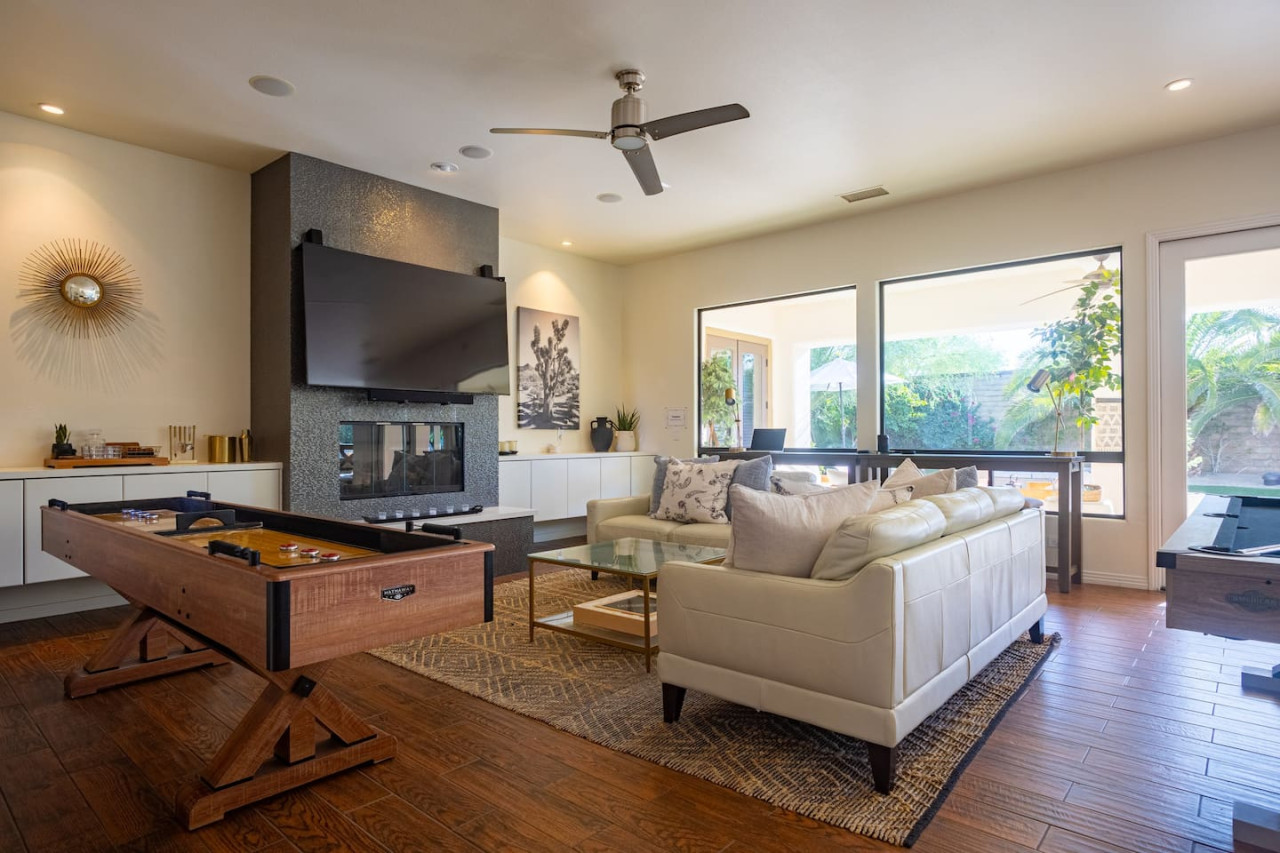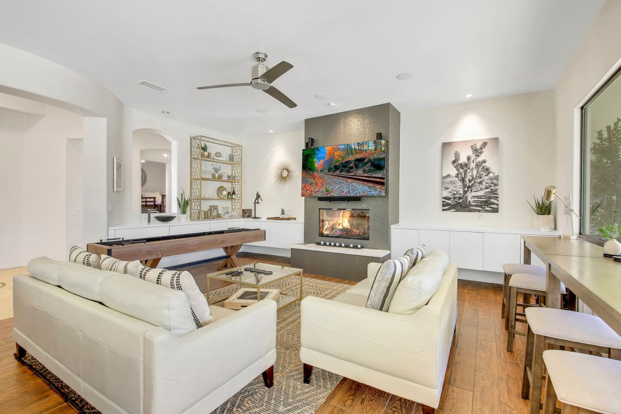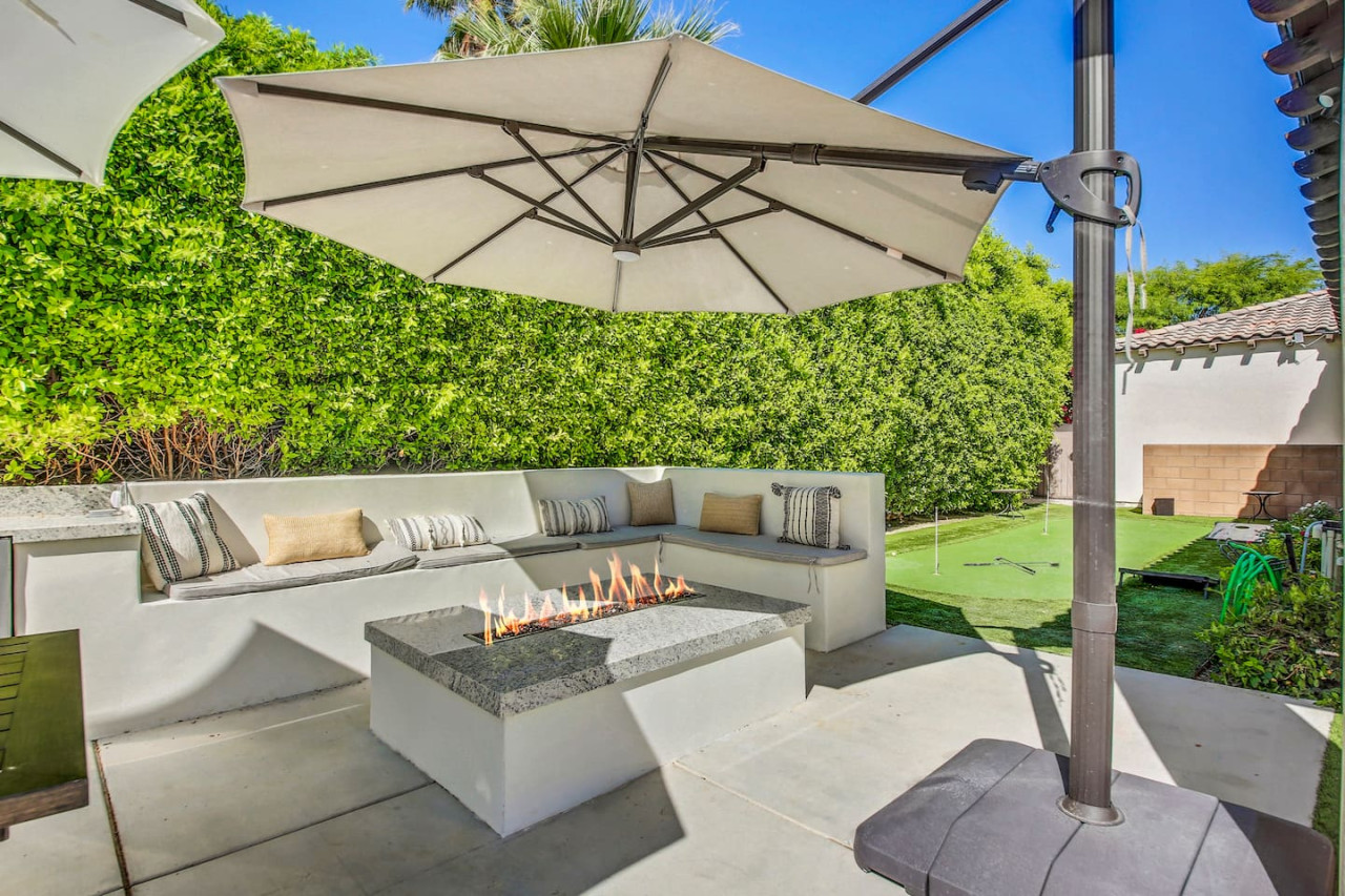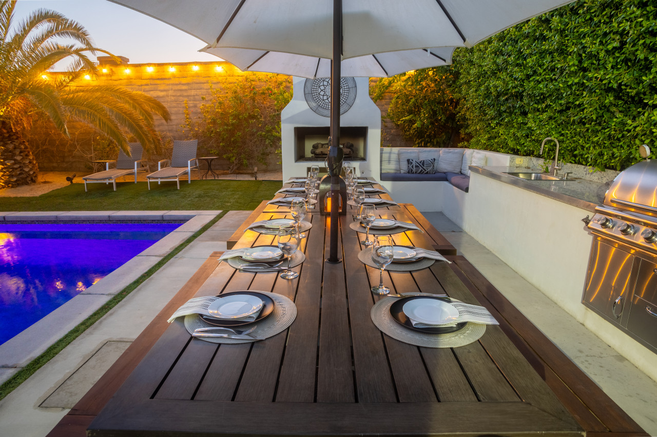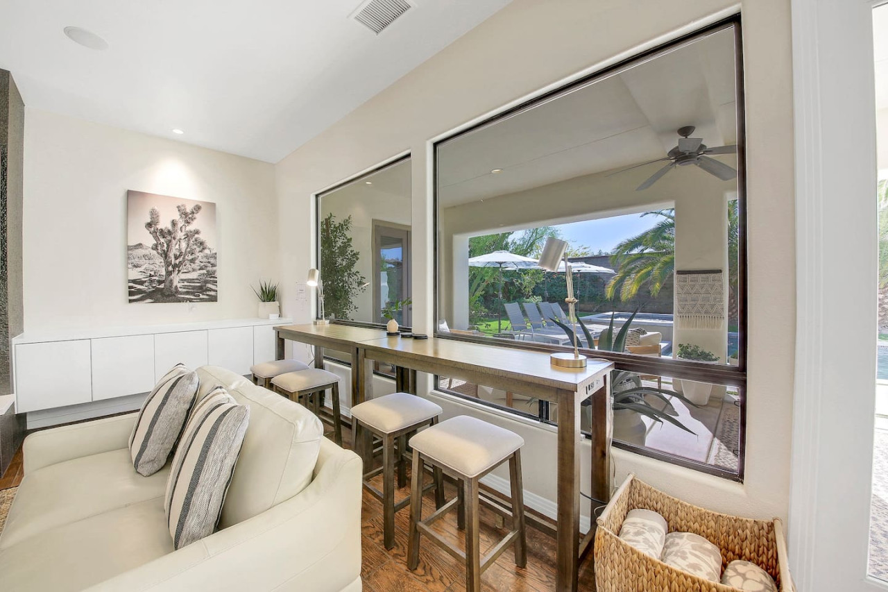 / nightWe are thrilled to announce that our stunning vacation property will be featured on the Emmy-Award winning show, "Staycation!" This is your chance to experience the luxurious charm and unique amenities that have captured the attention of the TV world. Escape to "Paraiso Del Sol," where paradise meets the sun. Enjoy desert-themed art, a spacious kitchen, and numerous amenities including a large pool, hot tub, outdoor kitchen with fireplace and firepit, putting green, and swaying palm trees. This gated Montage community home offers parking for 8 cars and is ideally located near Indian Wells Tennis Gardens, Polo Grounds, Coachella, and Stagecoach. Perfect for special celebrations, we offer exclusive Bachelorette and Birthday Decor Rentals with setup to make your gathering extra memorable. Choose from poolside patio decor, a mimosa bar, or a bride-to-be bedroom decorating package—or combine all three for the ultimate festive experience. Please inquire about these add-ons when booking to customize your celebration. Relax in the hot tub, soak up the sun by the pool, cook in the fully equipped indoor or outdoor kitchens, or gather around the firepit under the stars. Experience the luxury and fun of the ultimate desert getaway at "Paraiso Del Sol." Inside, the five-bedroom home features stunning desert-inspired artwork and modern comforts. The great room boasts a 75" Samsung smart TV and high-speed 1-Gigabyte Wi-Fi for seamless entertainment. Each bedroom has its own TV for convenience. Sleeping arrangements include: - Master bedroom with king bed and private ensuite - Second guest bedroom with king bed and private ensuite - Third guest bedroom with king bed and shared bathroom - Fourth guest bedroom with two double beds and private ensuite - Fifth guest bedroom with two sets of bunk beds (4 beds total) and shared bathroom - Additional powder room Step outside to your private, fully fenced backyard oasis complete with a sparkling pool, hot tub, and custom outdoor kitchen featuring a cozy fireplace and firepit. Nearby attractions include the Empire Polo Fields (under 5 minutes away), Old Town La Quinta (5-7 minutes), and Indian Wells Tennis Garden (10 minutes). For shopping and dining, head to Palm Desert/El Paseo (15-20 minutes). Joshua Tree National Park is an easy hour’s drive for breathtaking landscapes. With parking for up to 8 cars plus an EV charger, this desert haven provides everything for an unforgettable stay. As your hosts with extensive experience, we’re dedicated to making your visit exceptional—from local tips to personalized support. At Prestige Point Vacation Homes, we create spaces for families, friends, golf buddies, and girls’ retreats to connect and celebrate in style. Please note: By booking, you acknowledge the potential risks related to using house facilities and agree to assume responsibility for yourself and your party. Book your stay today and treat yourself to the ultimate desert retreat at "Paraiso Del Sol." Don’t forget to ask about our exclusive Bachelorette and Birthday decor packages to elevate your special occasion. Full access to the entire property. Notes: - Pool heating available at $75.00 per day. - Spa only available at $25.00 per day.