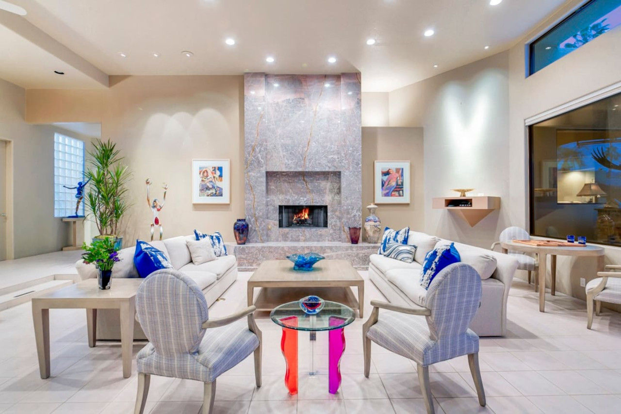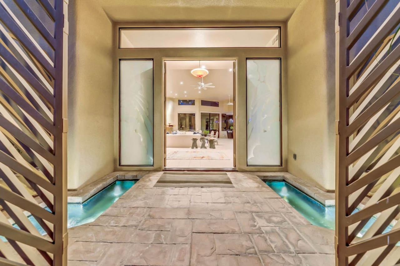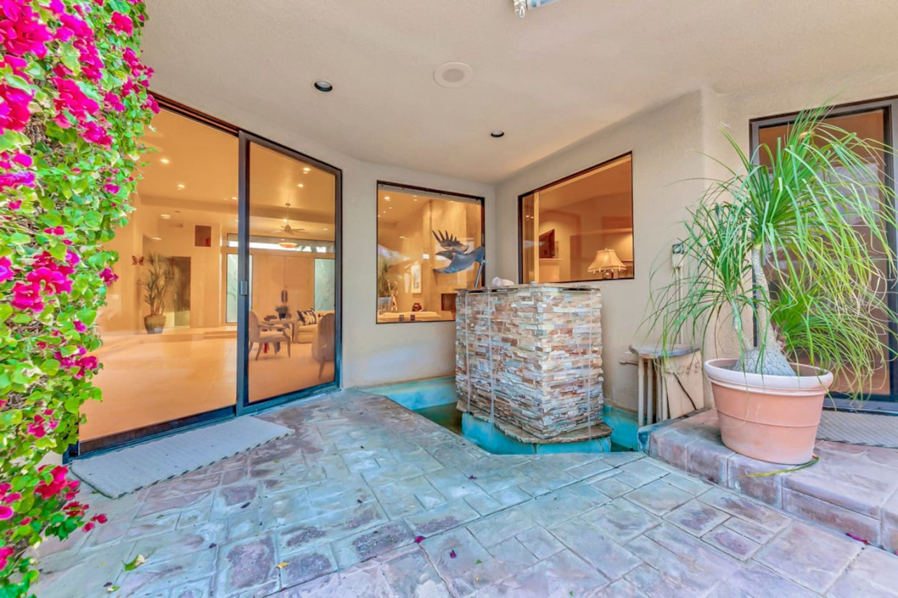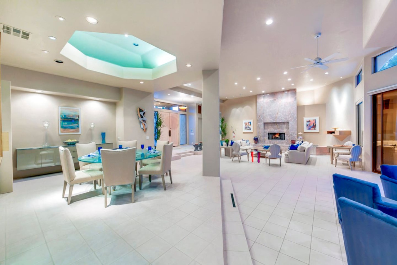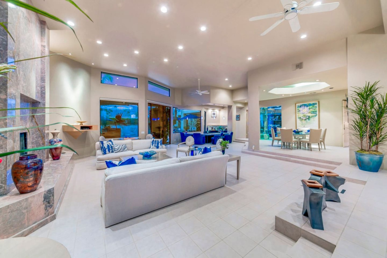 / nightExperience luxurious living in this stunning 4-BD, 4.5-BA home, w/5,007 sq ft of living space on a 16,117 sq ft lot, featuring a tranquil pool & spa area, complete w/breathtaking mountain views. Tile floors throughout. Two fireplaces create a cozy setting. Gourmet kitchen, a chef's dream w/skylight & premium Viking appliances. The property includes a 3-car garage & dedicated golf cart space. No neighbors on either side, so to enjoy the peaceful tranquility of your surroundings.