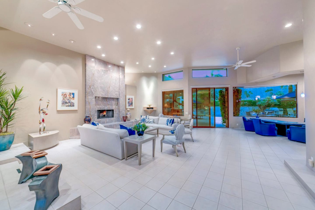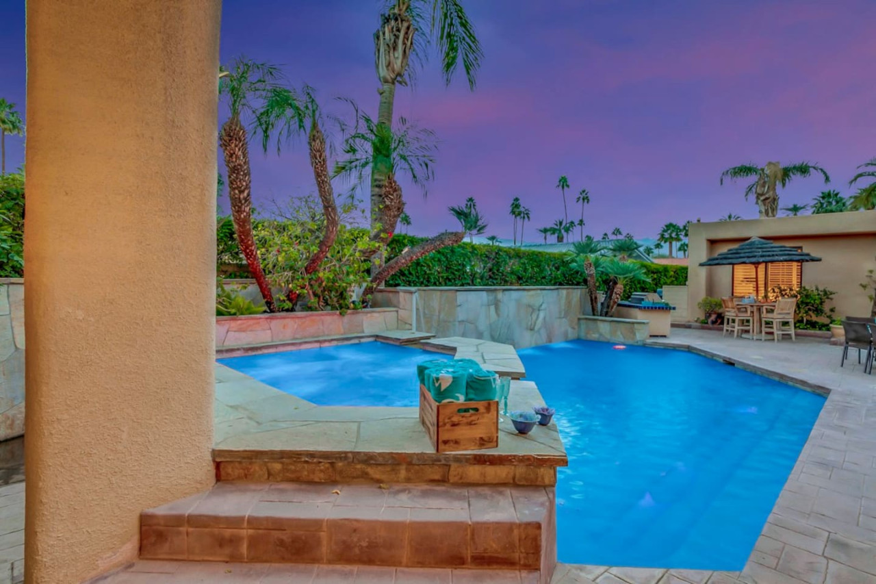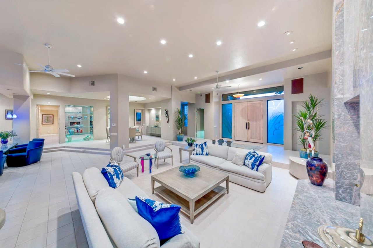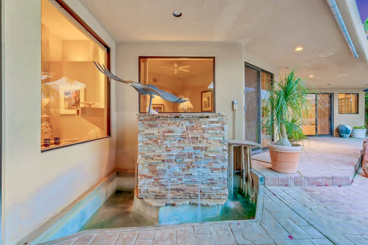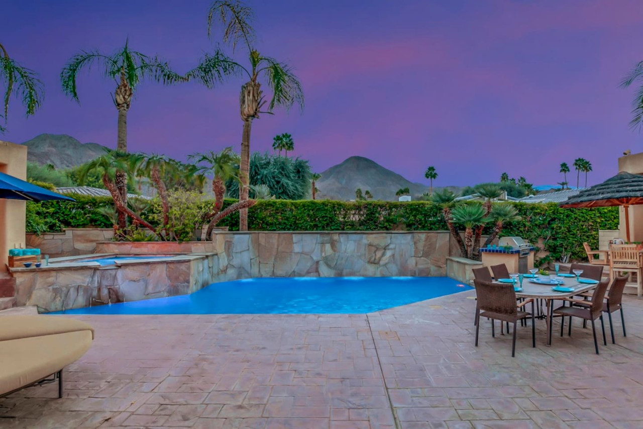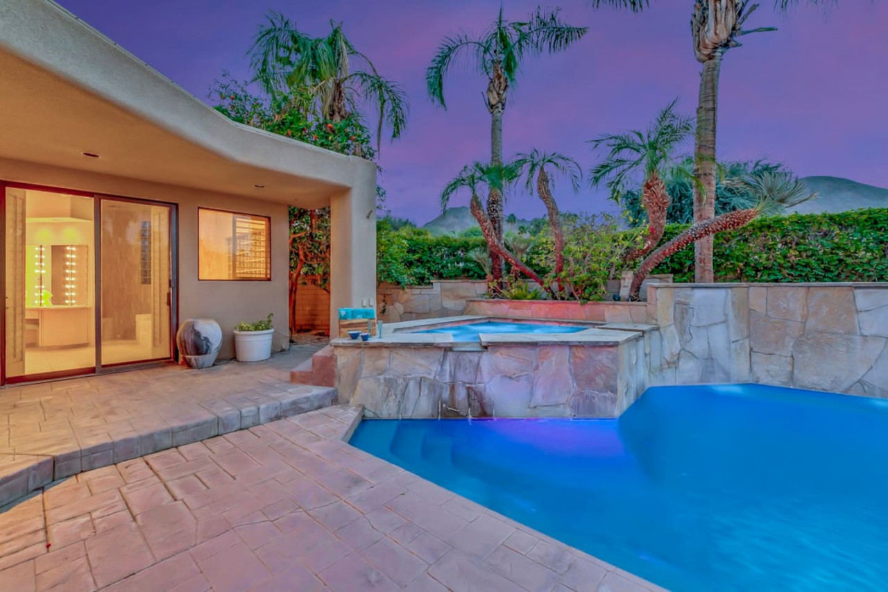 / nightExperience luxurious living in this stunning 4-BD, 4.5-BA home, w/5,007 sq ft of living space on a 16,117 sq ft lot, featuring a tranquil pool & spa area, complete w/breathtaking mountain views. Tile floors throughout. Two fireplaces create a cozy setting. Gourmet kitchen, a chef's dream w/skylight & premium Viking appliances. The property includes a 3-car garage & dedicated golf cart space. No neighbors on either side, so to enjoy the peaceful tranquility of your surroundings.