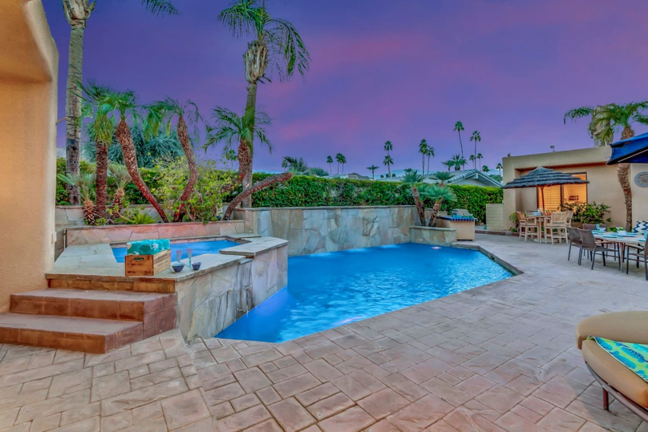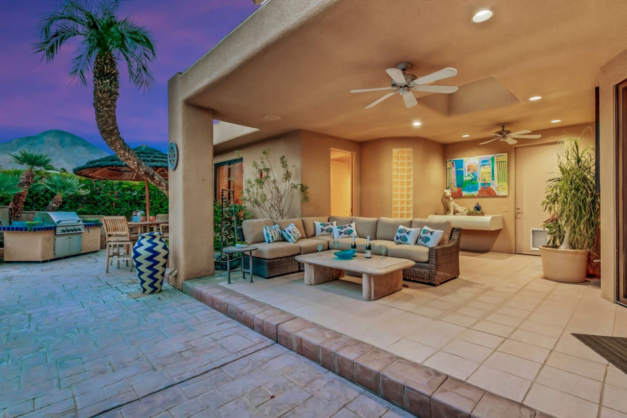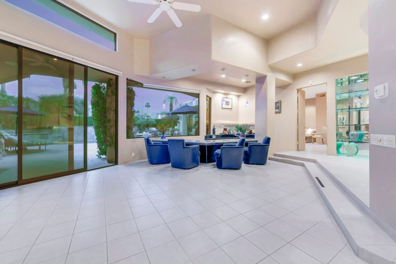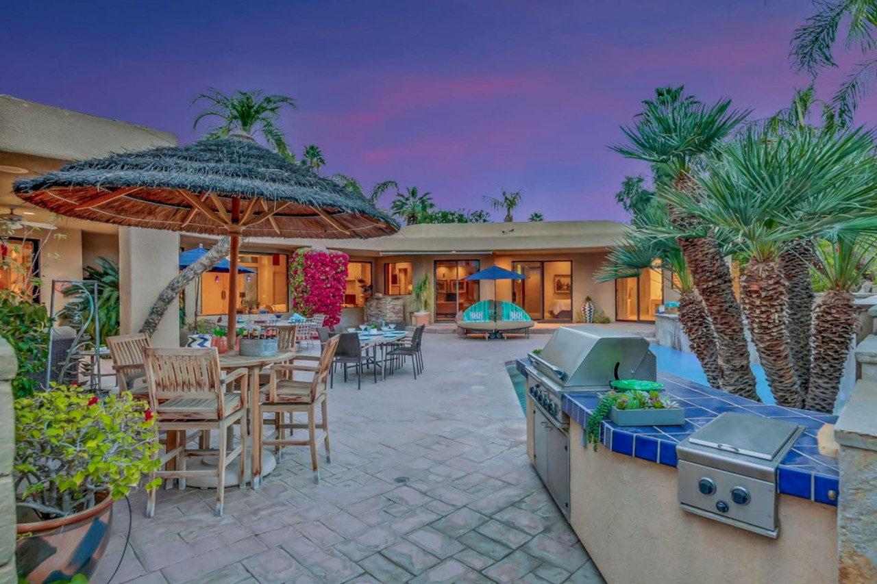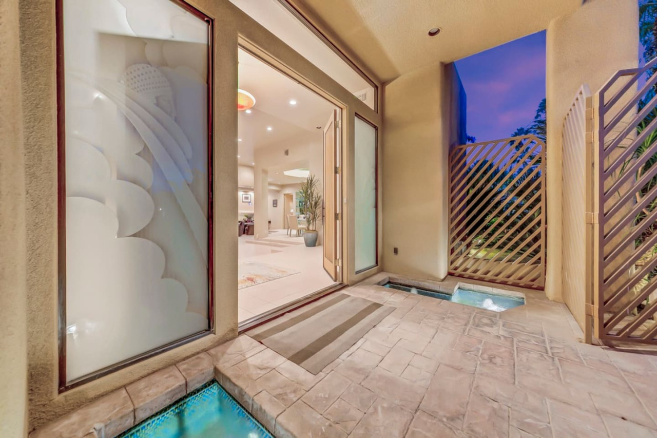 / nightExperience luxurious living in this stunning 4-BD, 4.5-BA home, w/5,007 sq ft of living space on a 16,117 sq ft lot, featuring a tranquil pool & spa area, complete w/breathtaking mountain views. Tile floors throughout. Two fireplaces create a cozy setting. Gourmet kitchen, a chef's dream w/skylight & premium Viking appliances. The property includes a 3-car garage & dedicated golf cart space. No neighbors on either side, so to enjoy the peaceful tranquility of your surroundings.