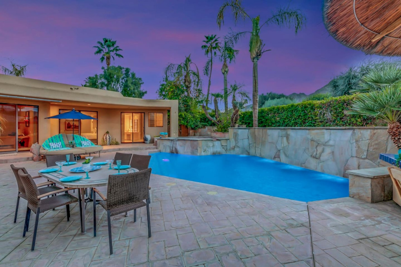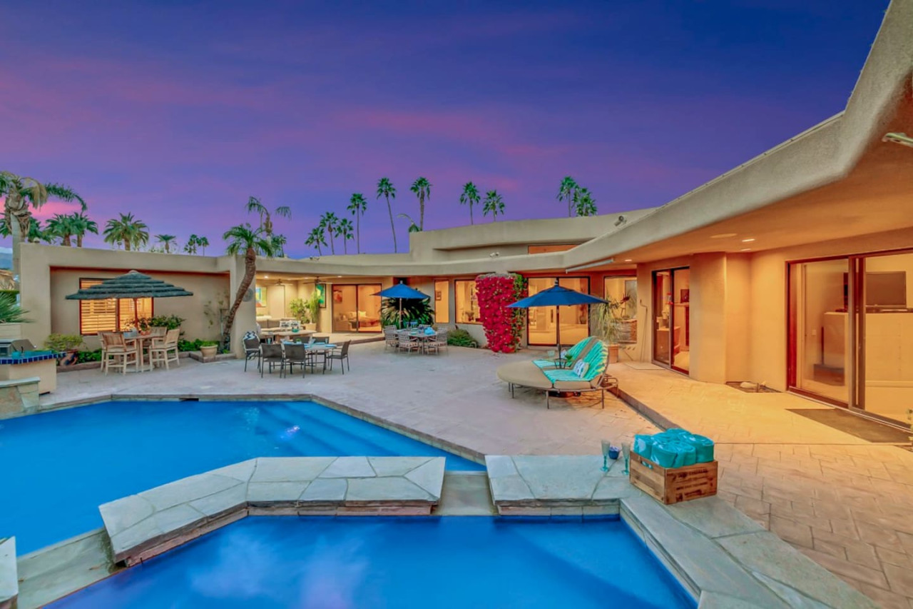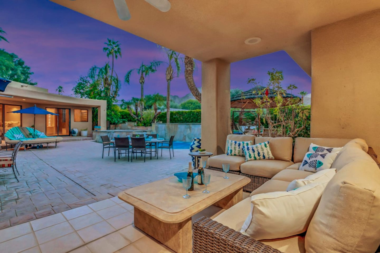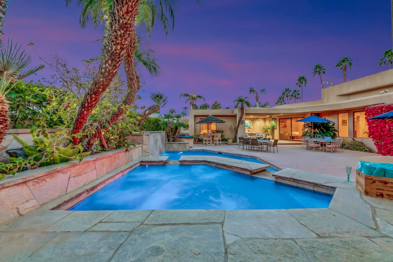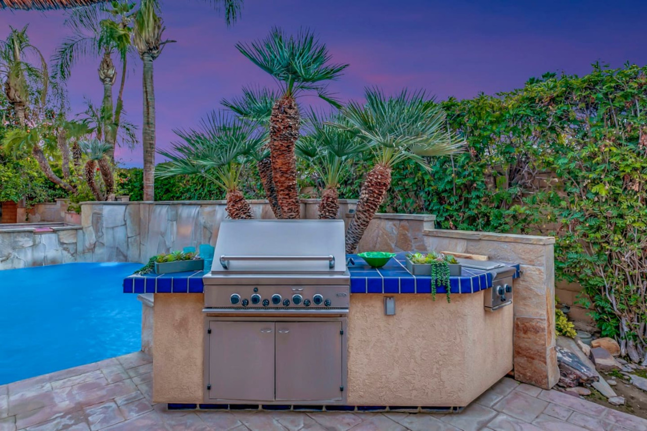 / nightExperience luxurious living in this stunning 4-BD, 4.5-BA home, w/5,007 sq ft of living space on a 16,117 sq ft lot, featuring a tranquil pool & spa area, complete w/breathtaking mountain views. Tile floors throughout. Two fireplaces create a cozy setting. Gourmet kitchen, a chef's dream w/skylight & premium Viking appliances. The property includes a 3-car garage & dedicated golf cart space. No neighbors on either side, so to enjoy the peaceful tranquility of your surroundings.